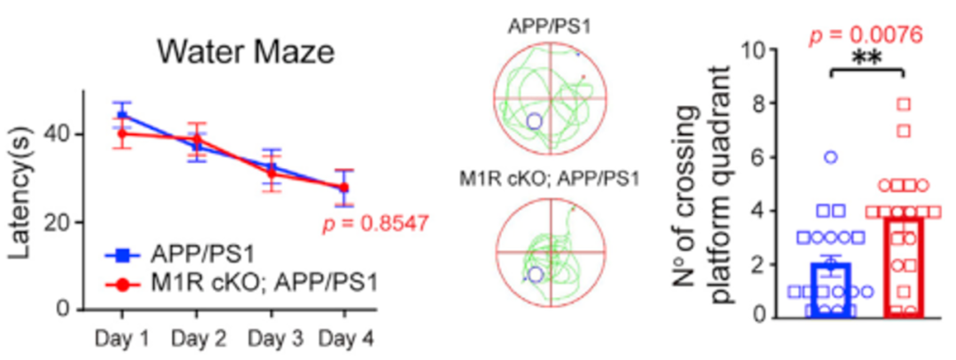 有趣的是,敲除M1R的野生型小鼠和正常野生型小鼠在水迷宫实验中的表现没有明显差异,这可能说明,敲除M1R可以特异性改善APP/PS1转基因小鼠的空间记忆。