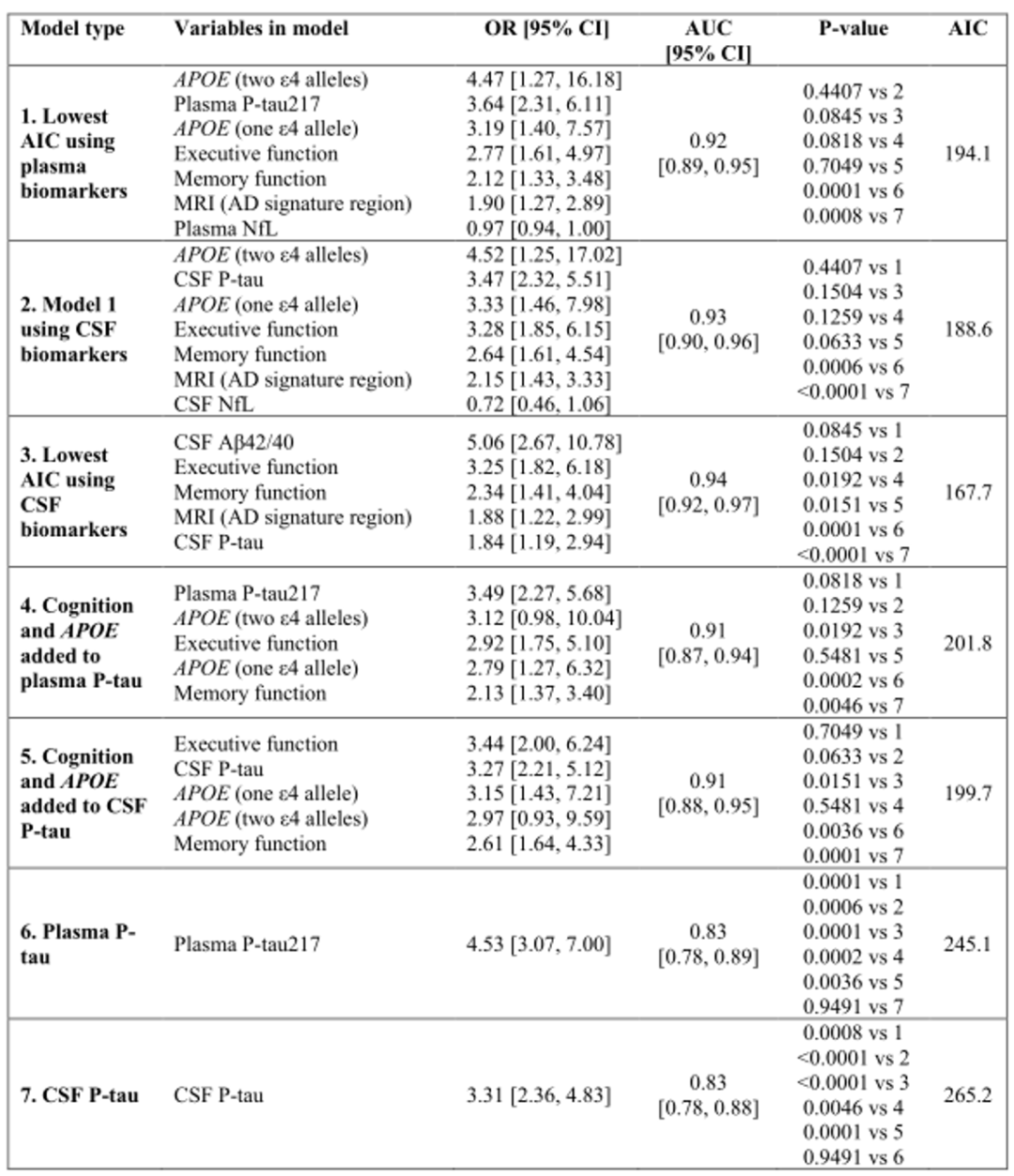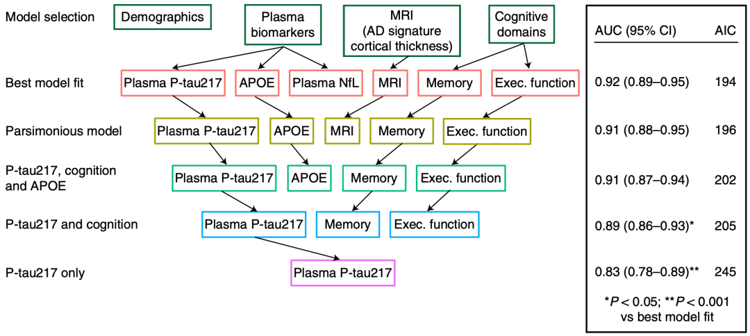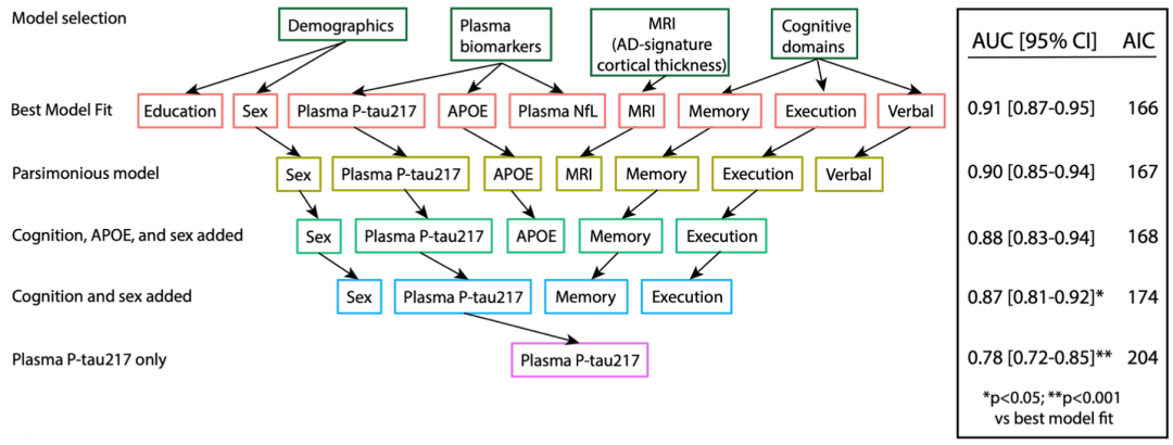 根据上述队列研究信息,研究人员首先构建了一个最优模型来预测AD的发生(AIC=194,AUC=0.92),模型中的变量包括血浆生物标志物(p-tau217,APOE,NfL),MRI及认知功能(记忆,决策功能)。