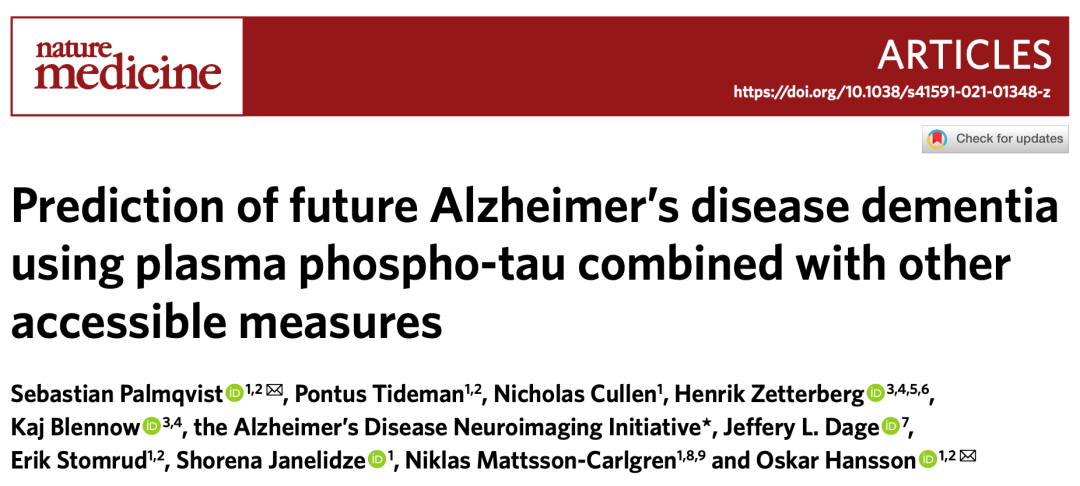 [1]Palmqvist S, Tideman P, Cullen N, et al. Prediction of future Alzheimer's disease dementia using plasma phospho-tau combined with other accessible measures [published online ahead of print, 2021 May 24]. Nat Med. 2021;10.1038/s41591-021-01348-z.