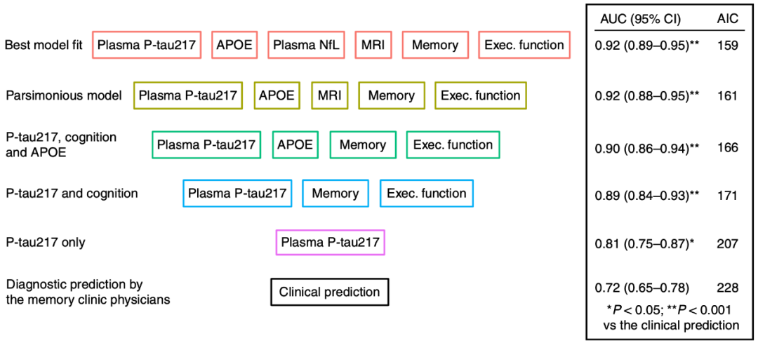 若在血浆p-tau基础上增加APOE,记忆和决策功能构建多变量模型,其拟合效果(AIC=166)和准确性(AUC=0.9)进一步增加,预测效果显著优于医生的判断。