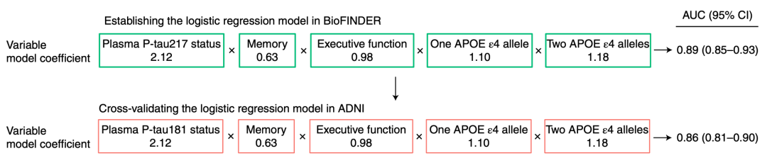 在确定预测模型中的关键变量为血浆p-tau,记忆,决策和APOE后,研究人员分别对BioFINDER和ADNI的数据建立逻辑回归模型,确定两模型的准确度分别为0.89和0.86。