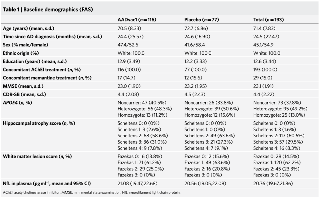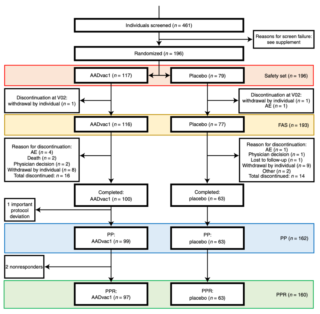 治疗组的患者先每月皮下接种AADvac1疫苗,共六剂;之后每三个月加强一次,共五剂。试验的最后一次随访是在2019年6月。在治疗的过程中有一些患者因一些原因退出了试验,最终163名患者完成了这项试验,其中 AADvac1 组共97名,安慰剂组共63名。