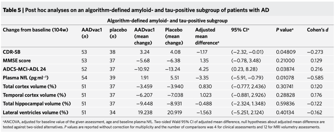 事后他们用一模型对所有患者进行模拟,发现有109位患者(93位完成试验)很可能兼有Aβ和Tau蛋白聚集。在这些患者中,CDR-SB和ADCS-MCI-ADL临床指标,以及血浆内NfL水平都有受到AADvac1 治疗的影响,意味着该治疗方案是可以在一定程度上改善病情的。