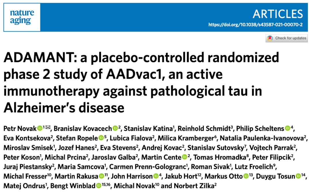 [1] Novak P., Kovacech B., Katina S. et al. ADAMANT: a placebo-controlled randomized phase 2 study of AADvac1, an active immunotherapy against pathological tau in Alzheimer’s disease. Nat Aging. 2021; 1: 521–534. https://doi.org/10.1038/s43587-021-00070-2