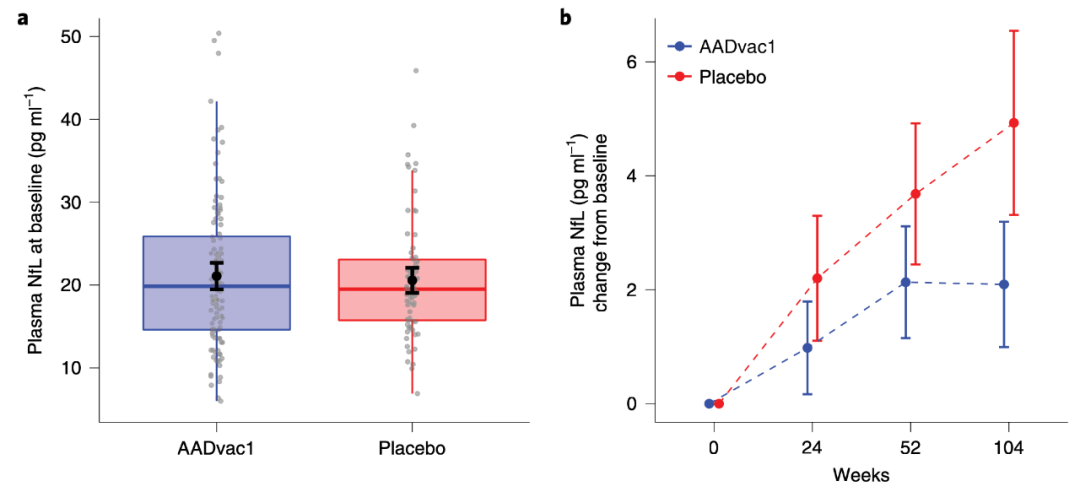 这项试验表明AADvac1可以减缓血浆中NfL的增长——与两年内NfL上升了27.7%的安慰剂组相比,治疗组仅上升12.6%,为正常增长速度;因此相对于安慰剂组,治疗组NfL的上升速度减缓了58%。