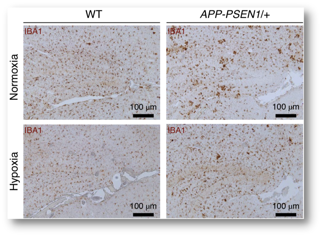 研究者将14月龄的AD基因敲除小鼠分别在正常氧气(21% O2)和缺氧(9% O2)条件下培养21天进行实验。结果发现,在缺氧条件下,鼠脑切片显现出存在更多的Aβ斑块沉积,蔓延和变性轴索,进一步突显了与HIF1激活相关的可变AD危险因素的相关性。