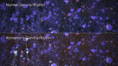 在这项研究中,蔡博士们注意到了一个现象,在大脑损伤、精神分裂和AD等疾病的患者大脑内,频率在30-90Hz的γ脑电波往往存在混乱。脑电波可以说是大脑神经元连接的具象化,γ波的混乱很有可能意味着神经元功能的错乱。这不由得让研究者猜想,如果能够通过一定手段将γ波复原,是否就能够恢复神经元的正常功能呢?