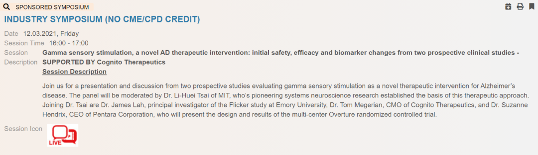 在近期召开的2021年第15届国际老年痴呆和帕金森氏病国际会议(AD/PD™2021)上,Cognito Therapeutics公布了数字疗法γ频率神经调节(gamma frequency neuromodulation)的2期临床研究数据,该疗法脱胎于此前我们曾经介绍过的MIT神经科学大牛蔡立慧和光遗传学大牛Edward S. Boyden团队的发现,40Hz声/刺激光可减少脑内的β淀粉样蛋白、改善认知。