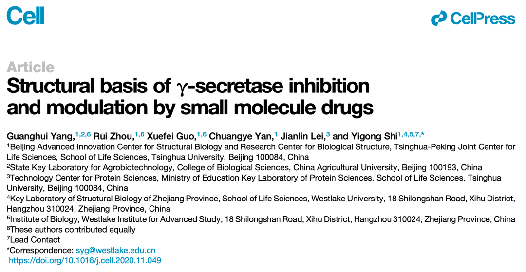 [1].Guanghui Yang, Rui Zhou, Xuefei Guo, et al. Structural basis of γ-secretase inhibition and modulation by small molecule drugs[J]. Cell, 2020.