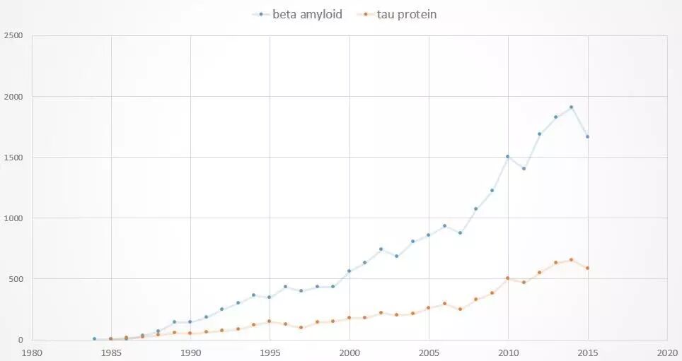 近30年β淀粉样蛋白(蓝色曲线)和Tau蛋白(橘红色曲线)研究论文发表情况,不难看出β淀粉样蛋白科研积累领先Tau蛋白15年左右