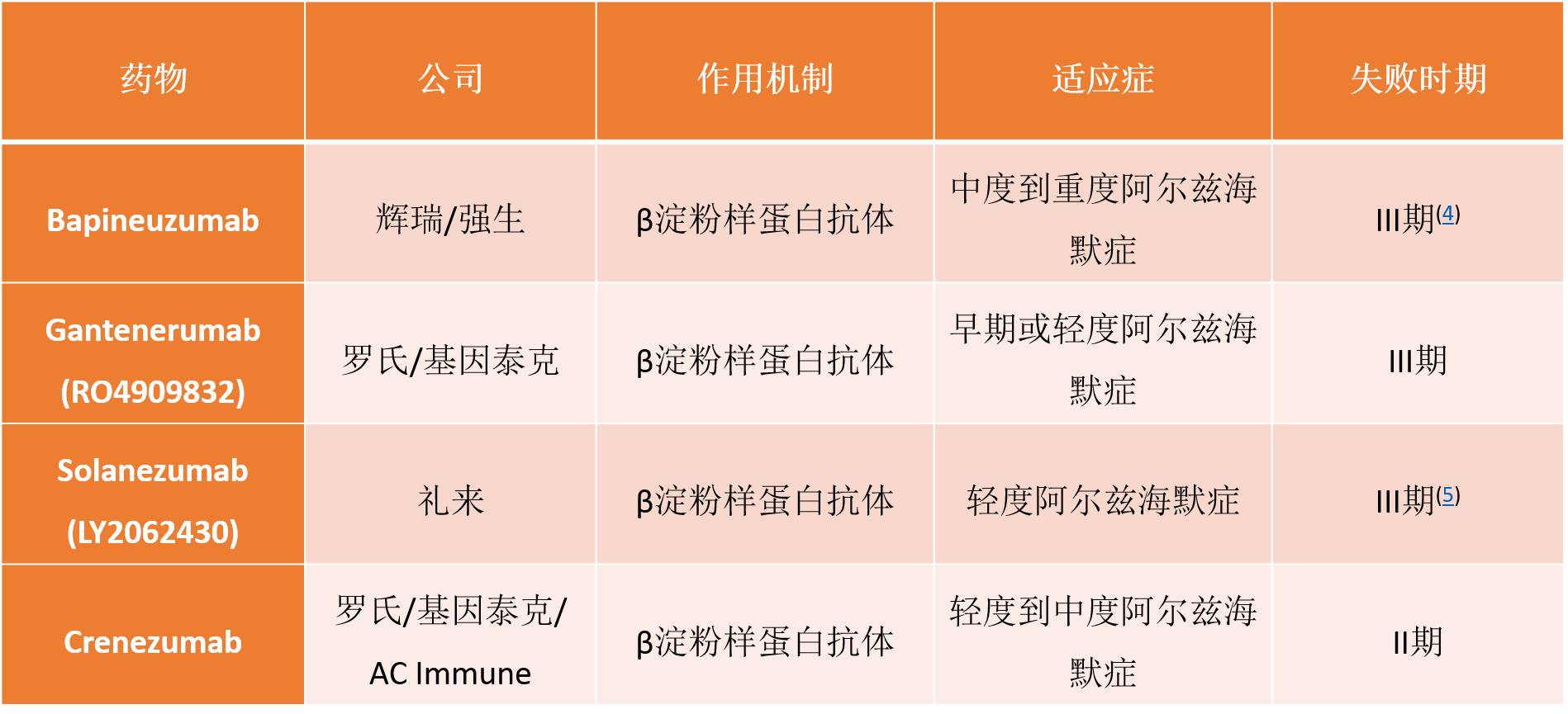 一直以来,辉瑞/强生的Bapineuzumab和礼来的Solanezumab被业界寄予厚望,2014年它们的失败,在业界引起了极大的震动。人们对「β淀粉样蛋白理论」的信心开始动摇。