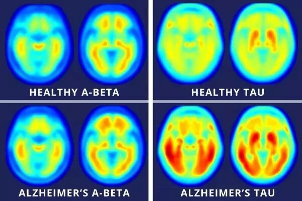 左面四个图为大脑中β淀粉样蛋白成像,健康人与患者差异并不大;右面四个图为大脑中Tau蛋白成像,能够很好的区分健康人和患者