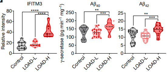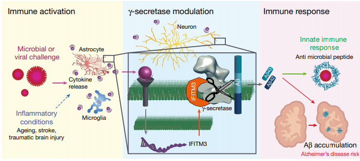 在体外培养的人诱导性多能干细胞衍生的神经元和星形胶质细胞中,均检测到了IFITM3的表达,在培养基中加入炎症因子γ-干扰素,模拟神经炎症的状态,发现这直接增强了γ-分泌酶的活性,来自哈佛脑组织资源中心的数据也表明,炎症相关因子,包括IL-6、IL-8、IL-10和IL-1β的水平都与IFITM3存在相关性。