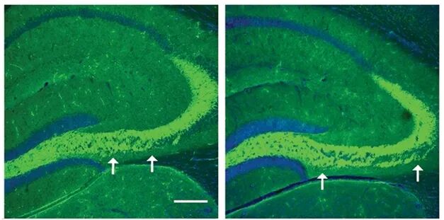 正常情况下,这些神经元将沿着海马的各层结构向外延伸,与其他脑区神经元形成新的突触,但是成年后敲除BACE1的小鼠苔藓纤维长度明显缩短了,神经元的连接方式也产生了混乱。这种变短的神经束大约占了30%,这也和缺失BACE1小鼠的表现是一致的。