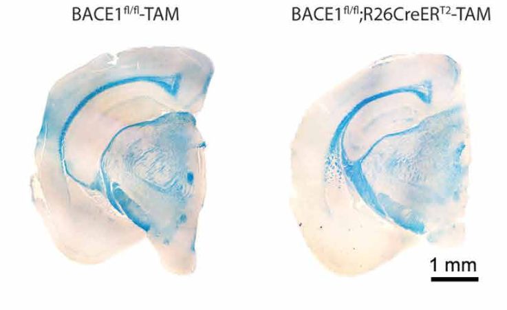 为了解决这个问题,西北大学的研究者们制作了两种不同的小鼠模型,一种在出生后不久即失去BACE1表达,这种缺失仅限于小鼠的前脑,从检测结果来看小脑和脑干仍旧存在BACE1的表达;另一种小鼠则在出生三个月成年之后,受他莫昔芬诱导实现全身敲除BACE1,由于他莫昔芬的渗透性不一致,小鼠皮质和海马中基本丧失了BACE1表达,不过皮质下区域和嗅球还存在一些BACE1。