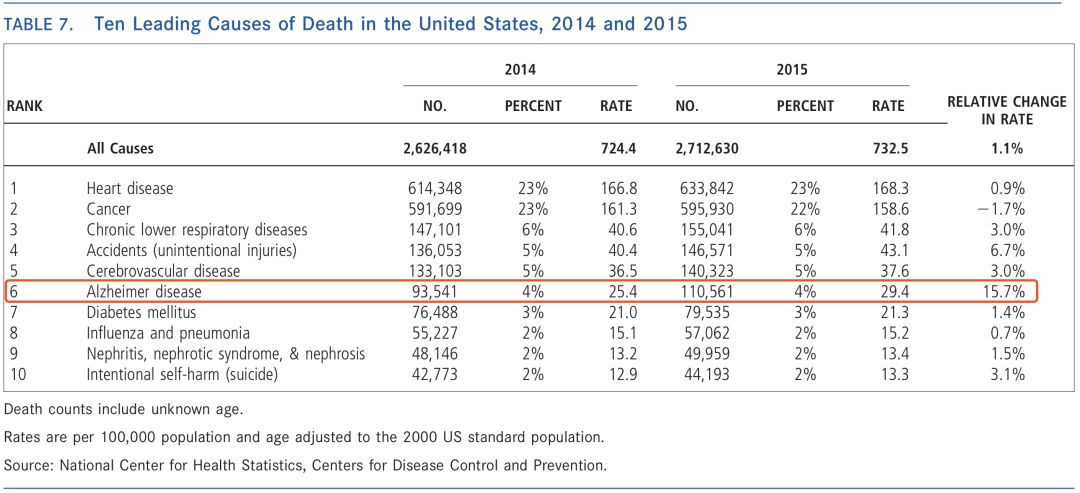 没错,排在第一和第二位的是心脏病和癌症,阿尔茨海默病杀死的人数只排在第六位。如果你再睁大眼睛看看表格最右边,你会看到这十大死因的增长趋势。