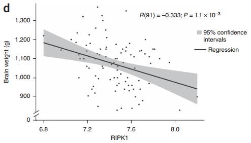 那么在AD的种种症状中,还有哪些与程序性坏死有关呢?首先就是大脑的重量,研究人员发现,三个关键蛋白中RIPK1的量与AD患者大脑重量呈负相关,而非AD患者的大脑重量则不受影响。