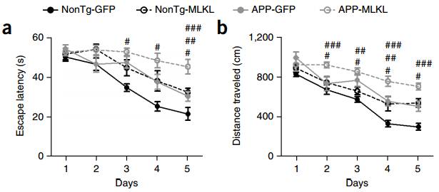 研究人员将含有绿色荧光蛋白(GFP)标记的MLKL蛋白转入一部分APP/PS1小鼠体内,发现小鼠的神经元逐渐死亡,剩余一部分小鼠只转入GFP,作为对照。3个月后,研究人员对这些小鼠和其他一些普通小鼠进行了Morris水迷宫测试。他们对小鼠进行了为期5天的“集训”,每天训练4次,让它们记住迷宫中隐藏的平台的位置和找到平台的路径。