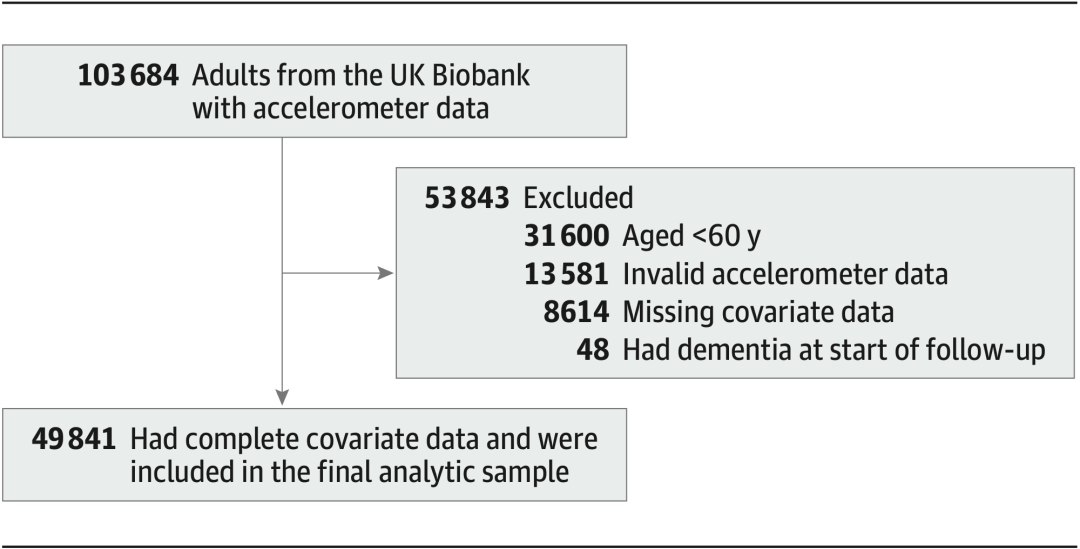 正是为了搞清楚久坐与痴呆之间的关系,Raichlen团队调用了英国生物库中49841名年龄在60岁或以上的老年人(平均年龄67.2岁,54.7%为女性)的数据。这些老年人有佩戴腕部加速度计的记录,且佩戴时没有确诊痴呆症。