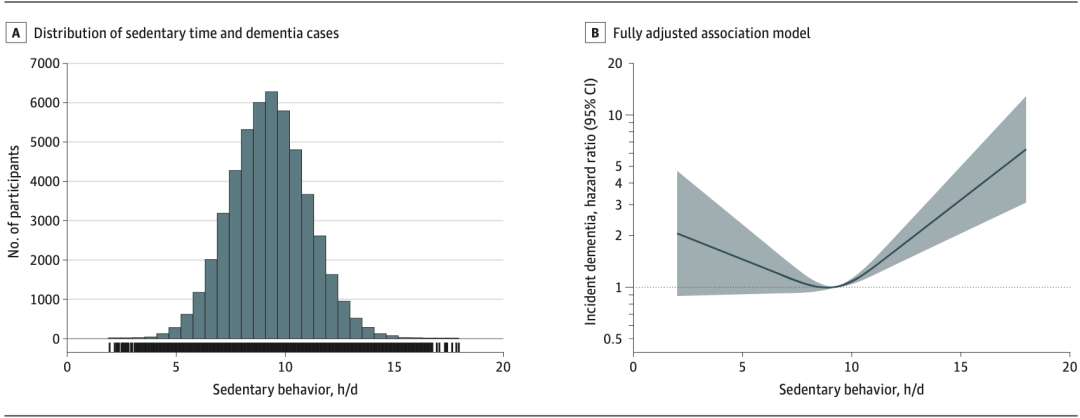 从Raichlen团队的这项研究成果来看,每日久坐时间与痴呆症发病率之间存在非线性关系,每天久坐约10小时后,痴呆症发病风险会增加,而且久坐不动的时间越长,全因痴呆症的发病率就越高。
