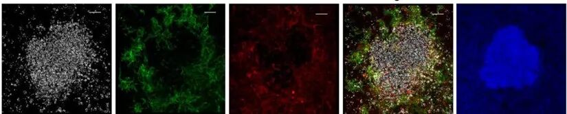 FIGG中的细胞核(左1)、小胶质细胞(左2)、星形胶质细胞(中)和白色念珠菌(右1)