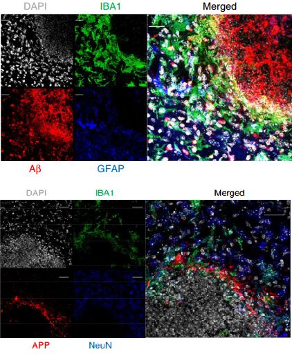 Aβ(上)主要存在于FIGG中心区内,而APP(下)在中心区周围