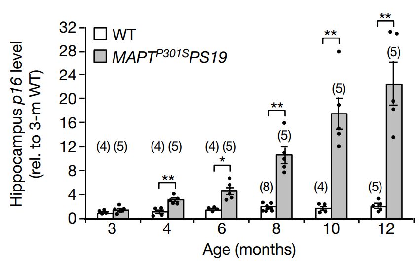研究人员首先检测了PS19小鼠脑中一种细胞衰老标志——细胞周期抑制蛋白 p16Ink4a的表达。结果不出所料,4个月大时,PS19鼠海马区的 p16表达就明显比普通小鼠高了,到了第6个月,大脑皮质中也出现了同样的差异,说明此时已经出现了不少衰老细胞。