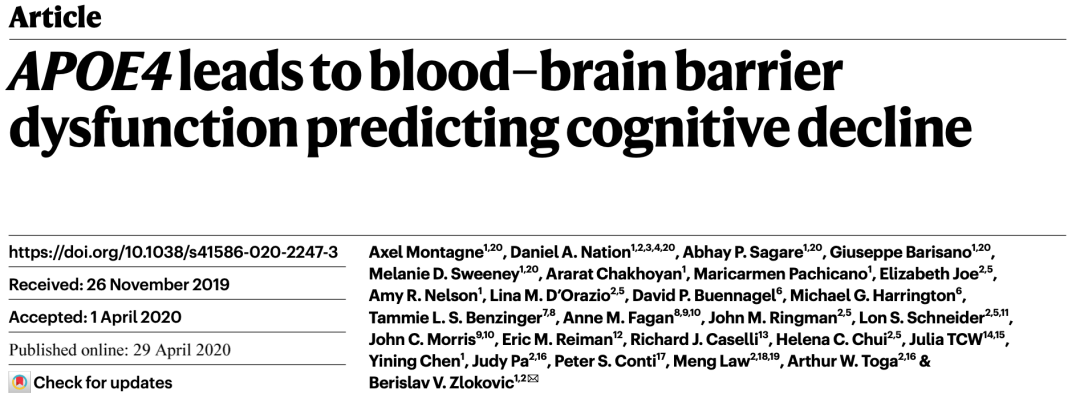 [1].Montagne A, Nation D A, Sagare A P, et al. APOE4 leads to blood–brain barrier dysfunction predicting cognitive decline[J]. Nature, 2020: 1-6.