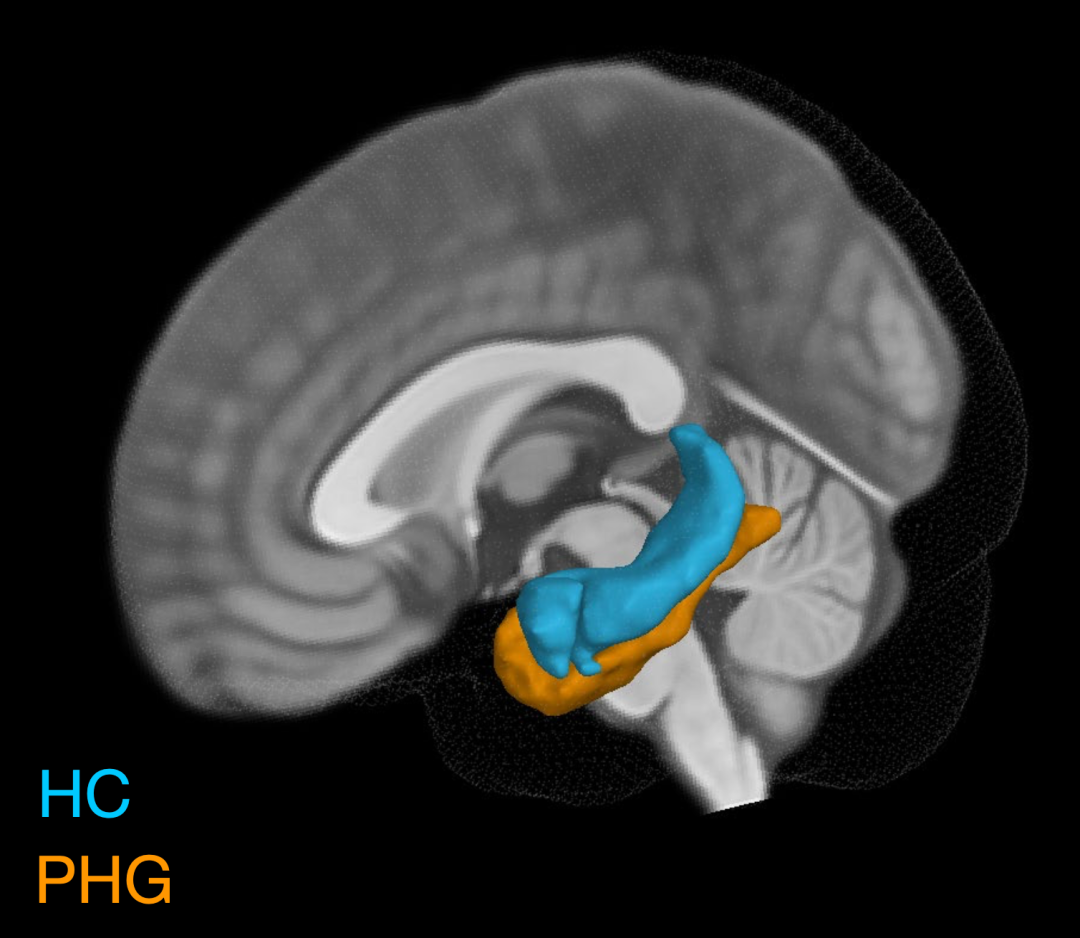 他们还观察到一个现象,APOE4携带者的海马体和海马旁回的体积,也会随着认知障碍而缩小,但是APOE3携带者没有表现出这种变化。