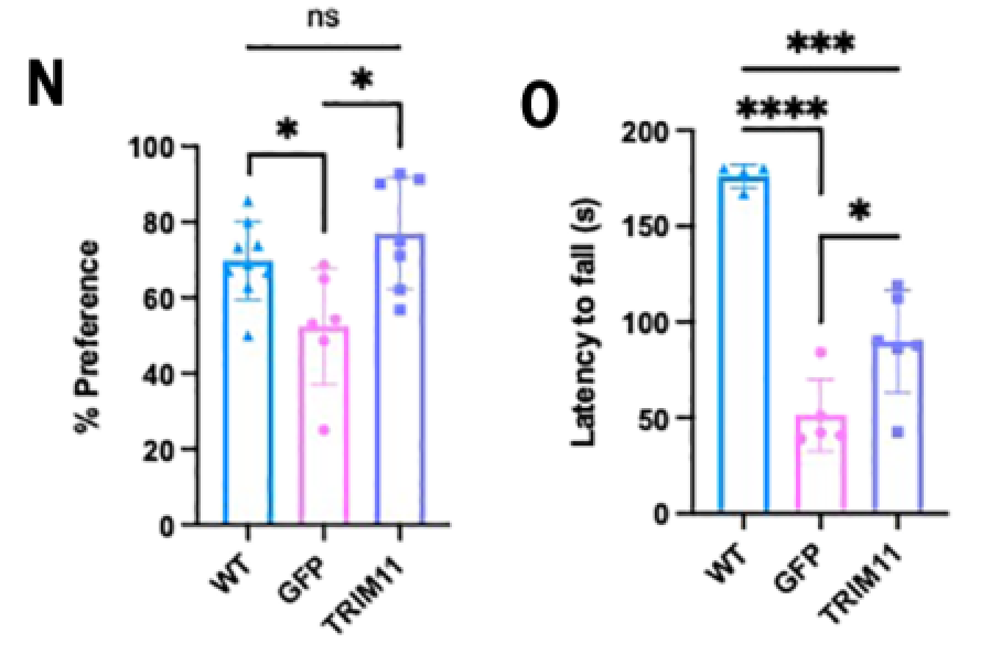 同时,小鼠识别新物体的能力也与野生型类似,说明TRIM11治疗避免了长期记忆的退化;小鼠的运动能力较对照组显著好转,但距离野生型仍有差距。