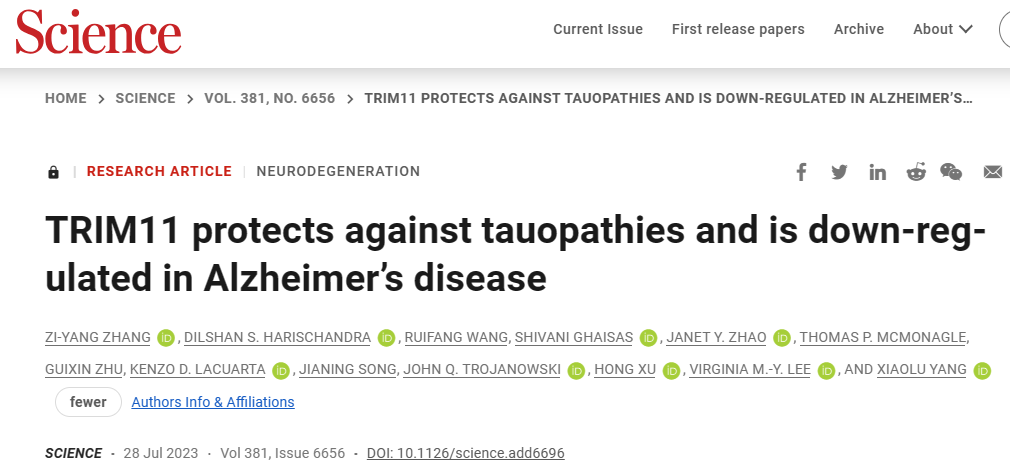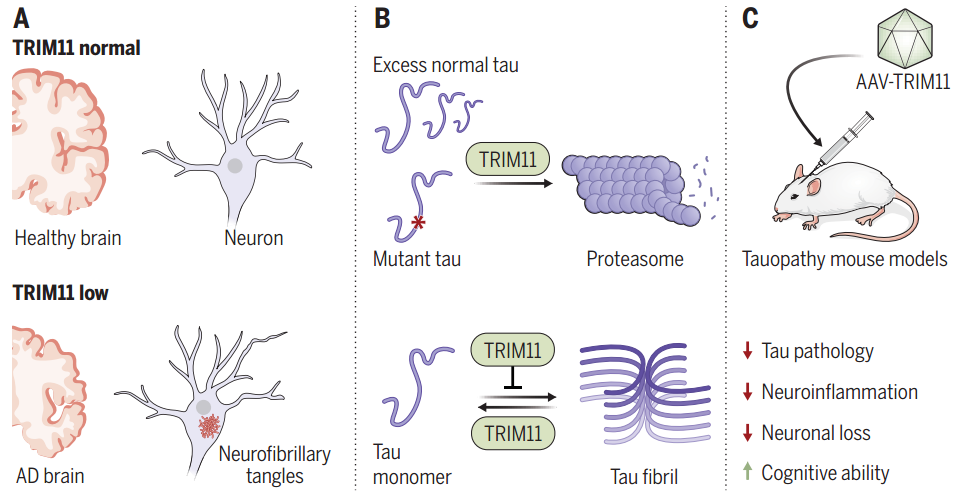 今日,《科学》杂志发表了来自宾夕法尼亚大学科学团队的一项新研究,研究者们发现了一种三基序蛋白TRIM11,它能以多种方式保护可溶性tau单体不发生错误折叠和异常聚集。在AD患者中,脑内TRIM11水平显著减少。