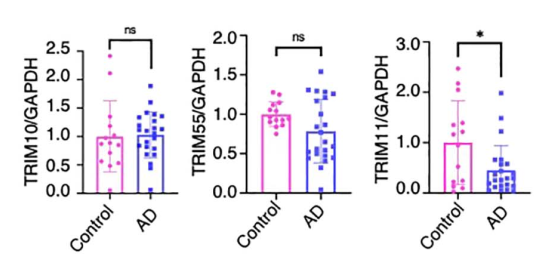 有趣的是,三者的mRNA水平在两组之间是接近的,而且TRIM10和TRIM55的蛋白水平也变化不大,而AD患者脑内的TRIM11蛋白水平显著下降,降低了约55%。