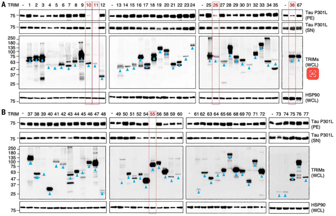 共培养的tau蛋白是tau P301L,这是一种家族性tau病常见的变异tau蛋白。在所有的75个TRIM中,TRIM10、TRIM11、TRIM55表现出了非常好的效果,几乎降解了所有的tau P301L聚集体。