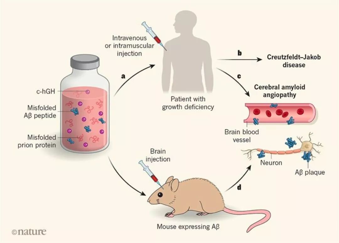 向小鼠脑中注射c-hGH后240天,小鼠的脑膜血管和脑实质里也出现了大量的β淀粉样蛋白沉积,而注射重组人生长激素的小鼠没有出现这样的病变。c-hGH中混有的Aβ确实能像朊病毒一样传播。