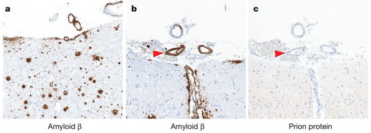 2015年,Collinge的课题组解剖了8名36~52岁的克雅病患者的尸体[4],他们都曾在童年接受过尸源性人生长激素的治疗。Collinge意外的发现,其中4人的大脑中,除了克雅病相关的病变,还有大量的β淀粉样蛋白(Aβ)沉积。这4人中,3人的皮层和脑膜里也有广泛的脑血管Aβ病变(CAA),剩下1人也有局部的CAA。