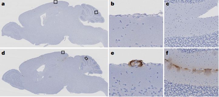 研究人员先向表达人淀粉样前体蛋白的小鼠脑内注射了阿尔兹海默病患者的大脑匀浆,120天后,小鼠脑膜血管和脑实质里果然出现了大量的β淀粉样蛋白沉积。
