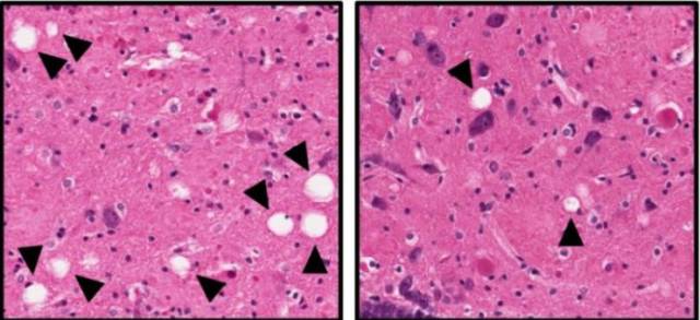 安慰剂大鼠(左)大脑出现了严重的神经损伤(箭头所指空泡代表坏死的神经组织)而接受P7C3治疗的大鼠损伤显著降低(右)