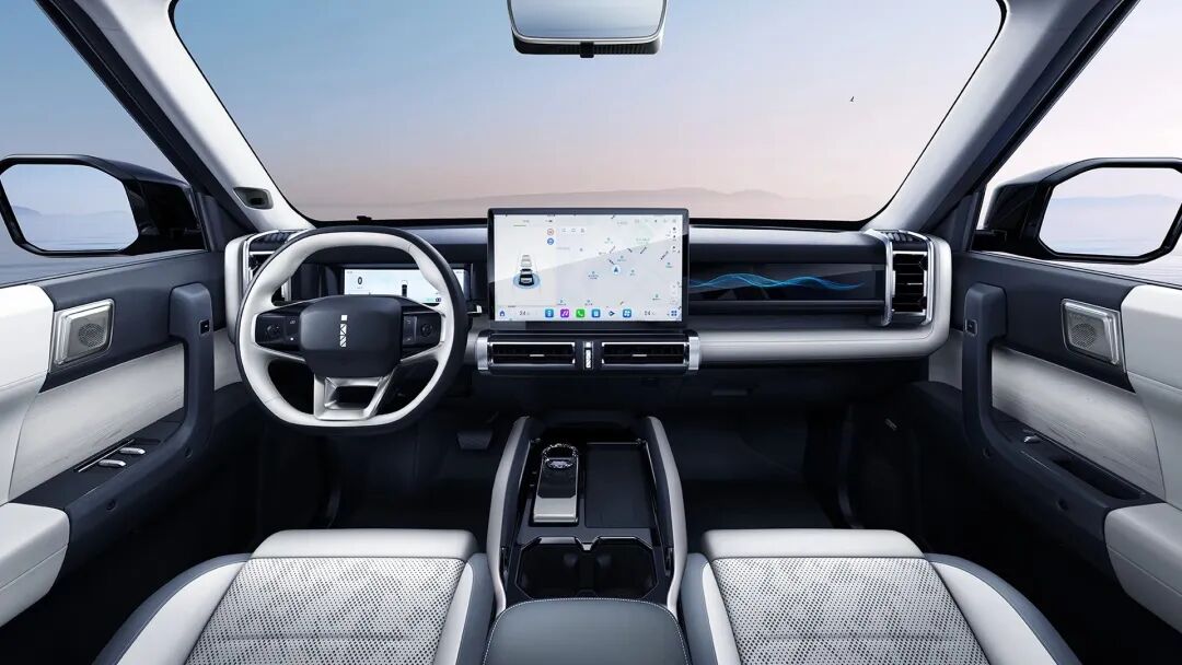 内饰方面,奇瑞iCAR 03采用了硬派风格的设计,包括硬朗的中控台造型和多种配色材质搭配,整体给人非常个性的感觉。中控台采用了T字布局,中央是一块15.6英寸液晶屏,下方的空调出风口也采用了类似弧形设计。