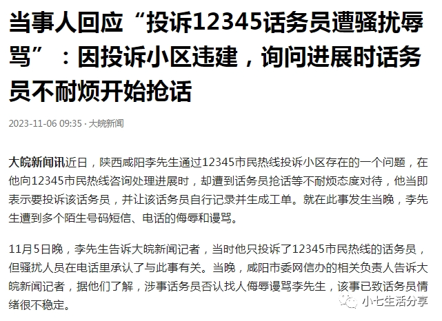 无独有偶,前段时间陕西咸阳曾有过一起“业主因小区违建问题向12345热线话务员被投诉,事后遭到多人骚扰辱骂”的事件。