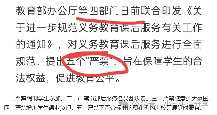 教育部等四部门曾联合发文规范课后延时服务,划定了五个严禁,旨在解决家长对服务收费问题。