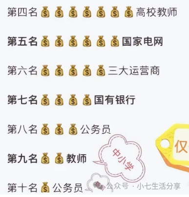 在网友爆出的体制内薪资待遇排行榜中,公务员并未进入前五名,而是排在了第八位。