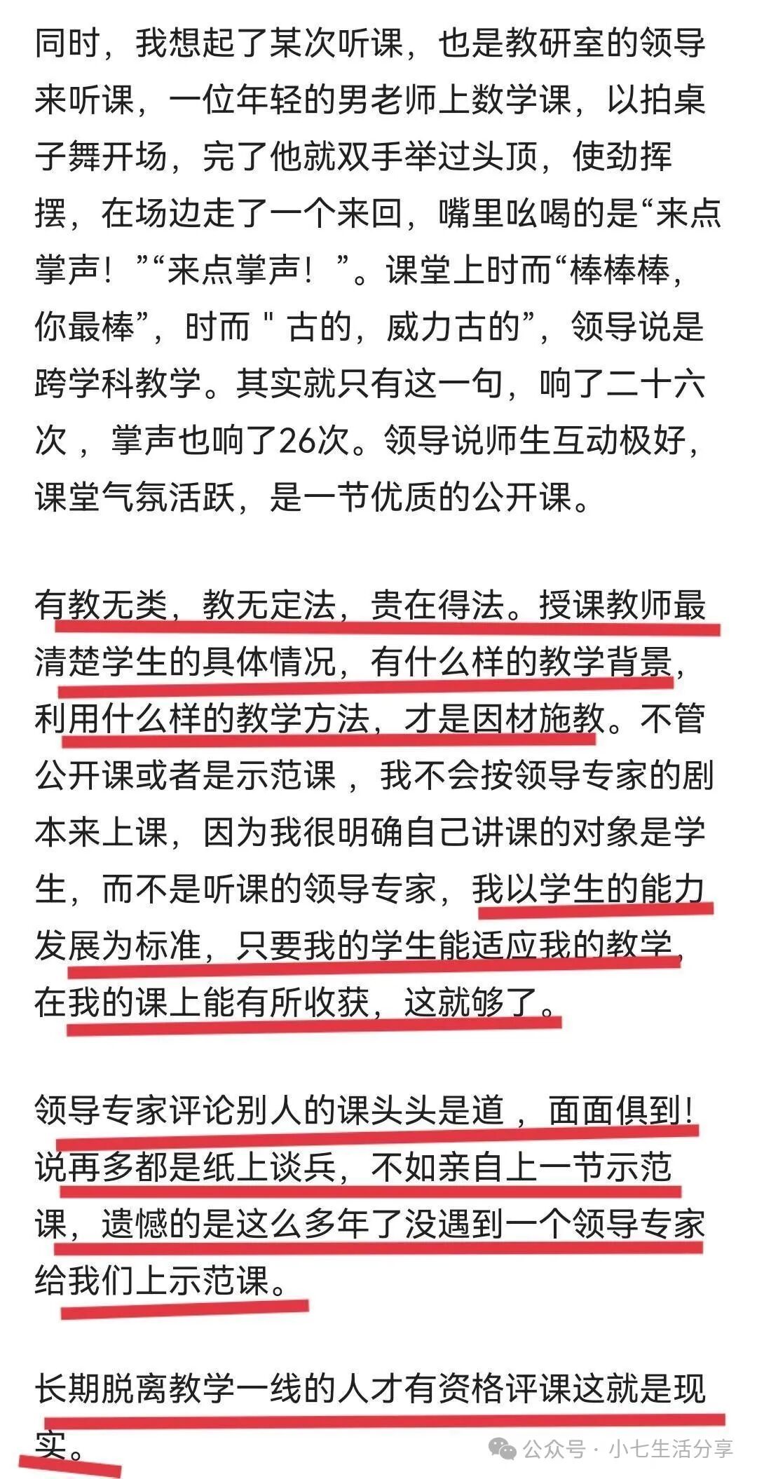 按照这位老师爆出的情况来看,这次的突击听课规模庞大,近20位教研员纷纷到场,使得教师只能选择自己熟悉的教学方式,以最好的状态迎接这场突如其来的考验。