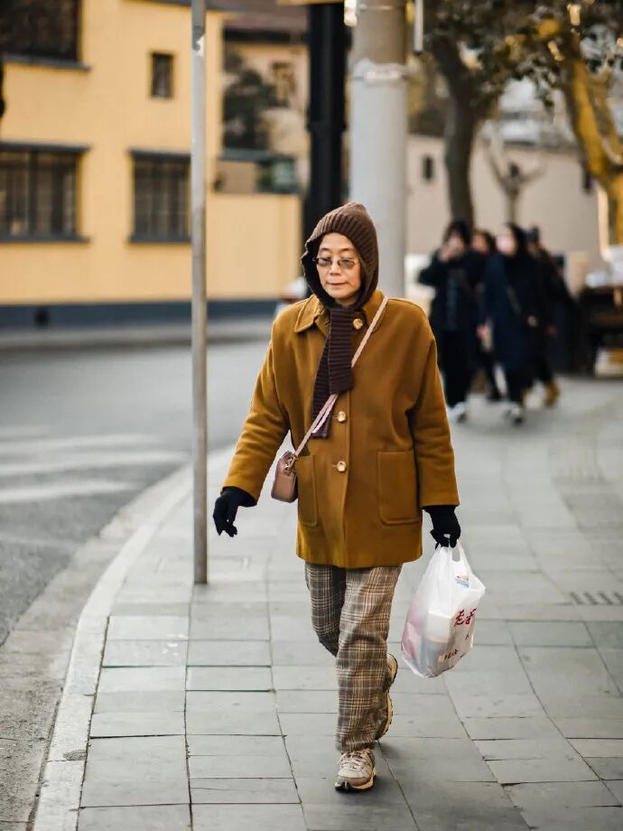 下面这位老太太穿的就是一件普通的再普通不过的黑色长款羽绒服了,但是它搭配了一双米白色的长筒靴,整个人看上去就非常有精神了,妆容也是经过细心打扮的,但是可以看出化妆的痕迹不是很多:涂了一个鲜艳度很高的口红,搭配一个夸张一些的耳环,整个人的精致度就提升了,这个世界上没有丑女人,只有懒女人。