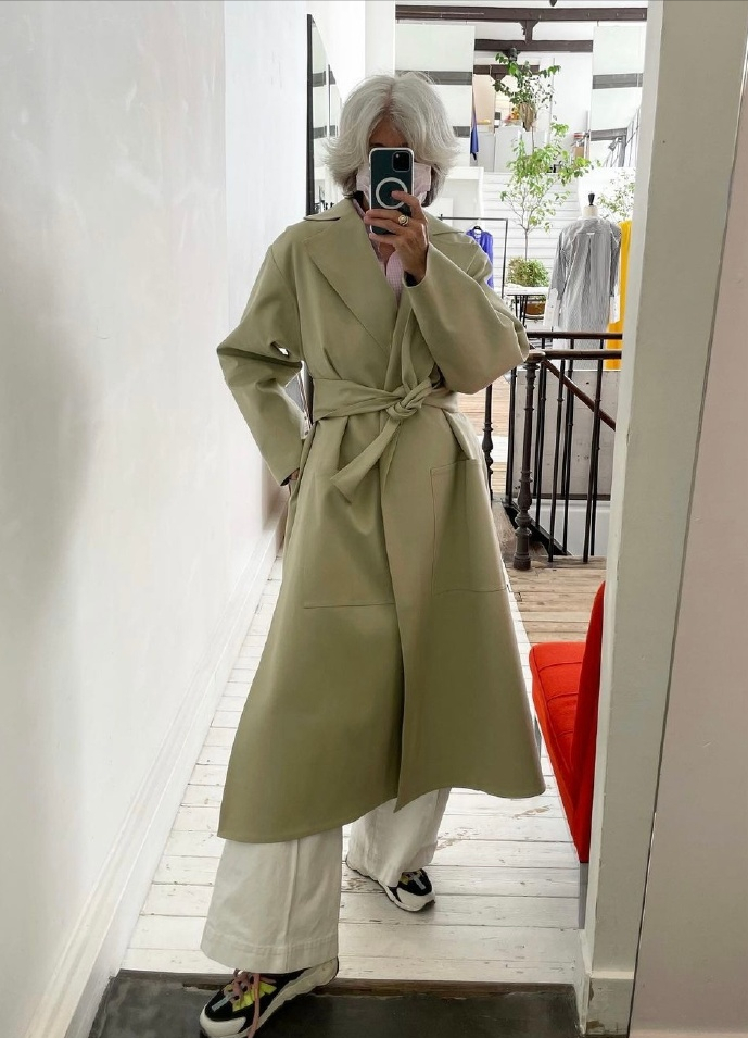 大胆一些的人可以尝试一些浅色的衣服,浅色的风衣外套,搭配流行度很高的白色阔腿裤,运动鞋也是老年人的专属,这样的混搭让人看上去个性十足,即便是头发花白又如何,照样青春满满!