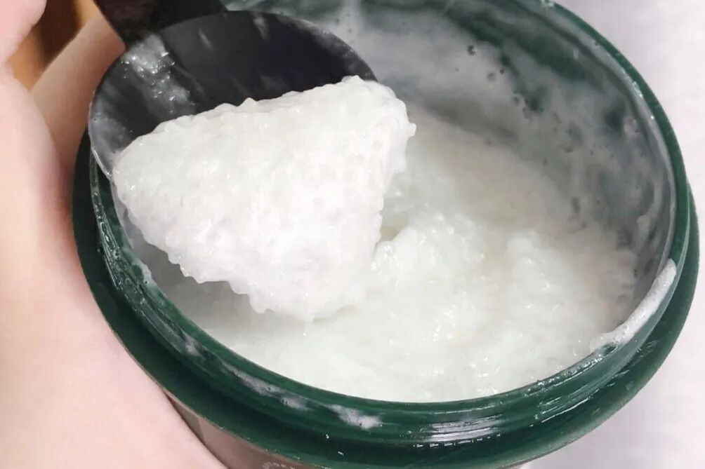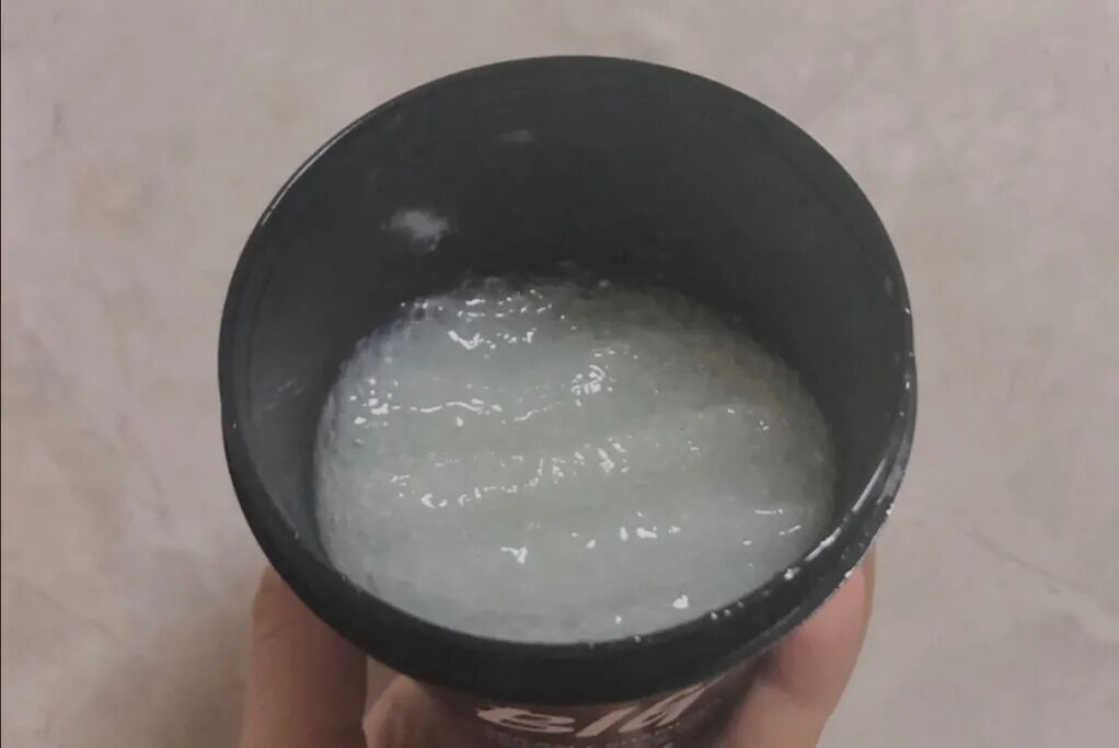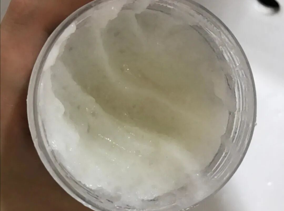 是这种糊糊的质地,可以看到它的颗粒很大,而且它的颗粒不容易融化,泡沫没有那么丰富。主打的是顺滑和蓬松,虽然清洁力比较温和,但也不要经常用。使用感是海盐颗粒按摩舒服,但是如果海盐颗粒不融化,一颗一颗的会掉下来,不过香味是真的爱了。