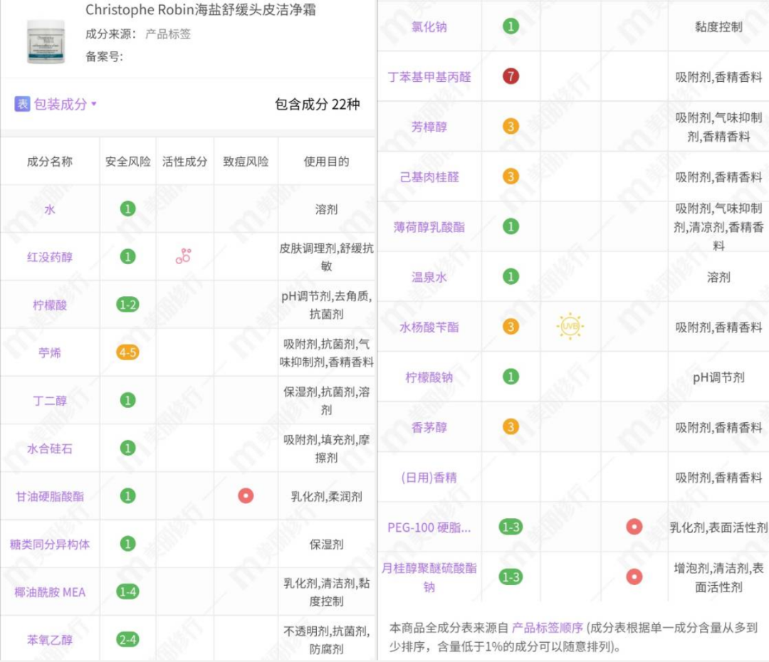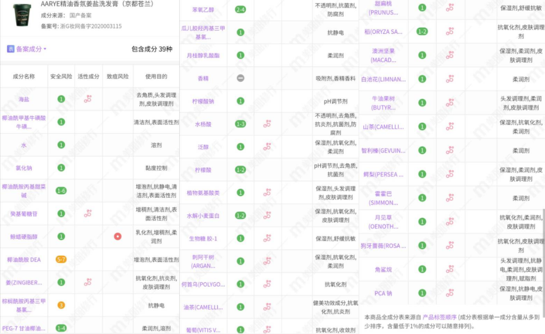 含量排第一的是海盐成分,这里的成分表就是明确海盐成分,还是很实在的。添加的是S类的表活,海盐和柠檬提取都能够抗炎,头皮长痘痘的可以试试。它这里的香精也是比较多的,但是含量不是很高,还是安全ok的。Aarye洗发膏