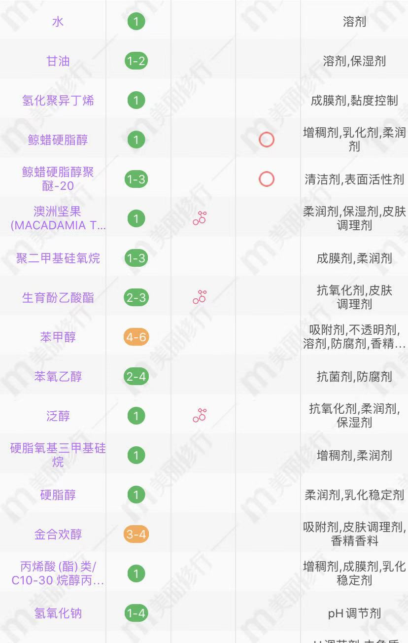 从成分方面来说,这款润肤乳主要用到的是溶剂和保湿剂添加的甘油比较多,后续添加的活性成分有澳洲坚果籽油、泛醇等,从肤感方面来说稍微有一点点厚重,一般的油性皮肤还会觉得不太好吸收,不过干性皮肤使用起来会觉得比较舒爽,适合敏感皮肤。