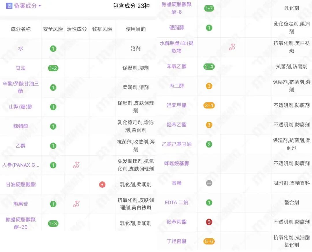 主打的成分,人参和胎盘素的含量也比较多,保湿、抗衰老还是值得信赖的。
