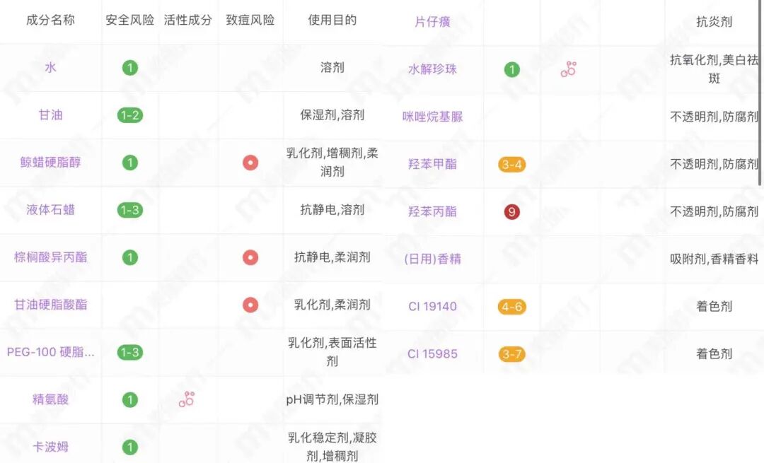 成分不算多,含有致痘成分,除了主打成分片仔癀,还添加了精氨酸和水解珍珠两种活性成分。