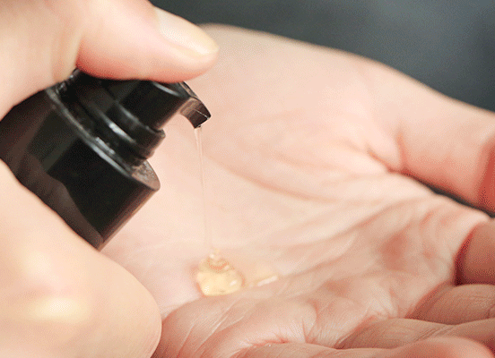 就用护发精油举例——将护发精油挤在手心,然后双手搓热了之后,由上而下涂抹在头发上: